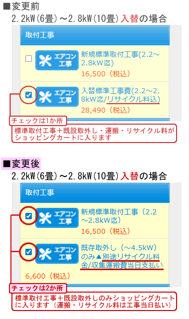 (取り外したエアコンの)運搬リサイクル料が「商品と一緒に先払い」から「工事当日払い」に変わります。